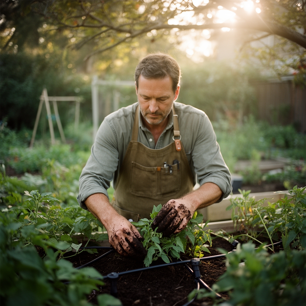 Organic amendments: Pre-season incorporation of 4-4-4 feather meal or 3-2-2 composted manure builds soil microbial populations. Layer 2 inches across beds before installing tubing.